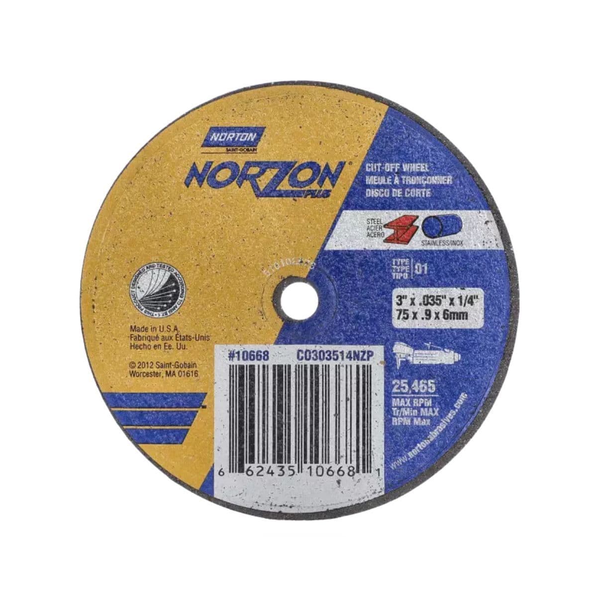Meule à tronçonner de petit diamètre NorZonMD Plus 3 po x 0,035 po x 3/8 po, grain 60