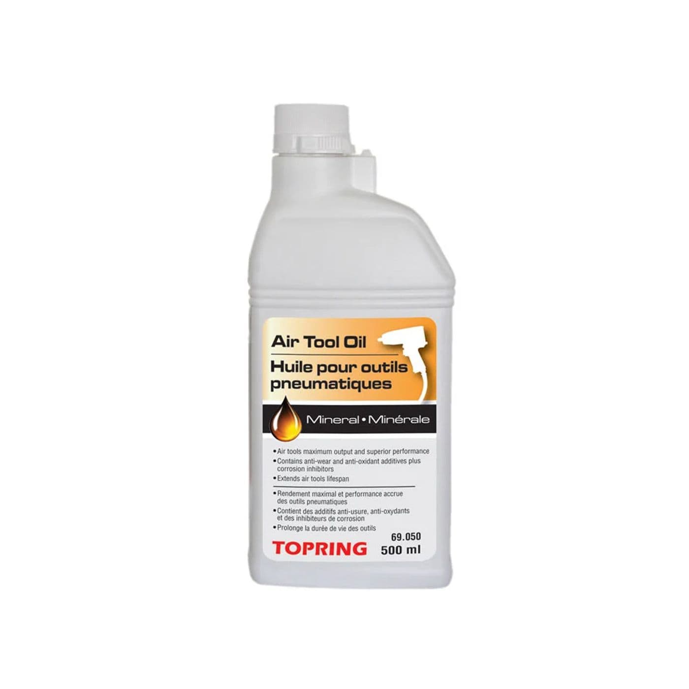 Cette huile minérale est parfaite pour tous les types d’outils à air, tels que clés à choc, marteaux, meuleuses, ponceuses, perceuses et tous autres outils à air ou équipements pneumatiques. Elle convient également pour les valves pneumatiques, cylindres pneumatiques et moteurs à air requérant une lubrification adéquate. Composition minérale non détergente pour un rendement maximal et une performance accrue des outils à air. Contient des additifs antiusures, des antioxydants et des inhibiteurs de corrosion qui dissout la gomme et les dépôts pour prolonger la durée de vie des outils à air. Prévient la formation de rouille, l’accumulation de carbone et de vernis pour conserver la vitesse et la puissance des outils à air. Le format de 500 ml possède un bouchon avec bec verseur.