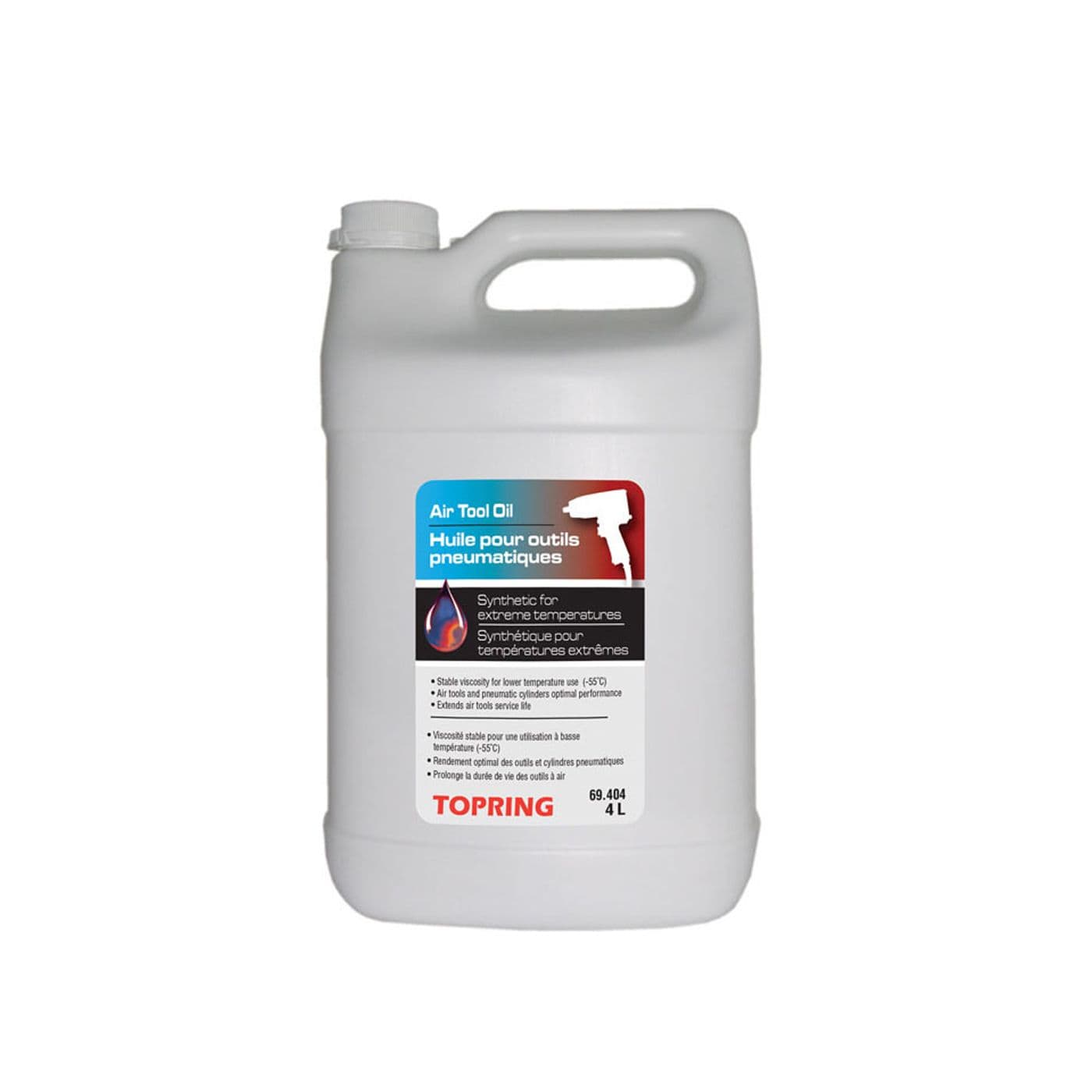 La lubrification des outils à air est l’un des facteurs d’entretien préventif le plus important à considérer. Tous les outils à air, les valves pneumatiques, les cylindres pneumatiques et les moteurs à air qui doivent être lubrifiés à des températures extrêmes. La majorité des bris d’outils à air sont causés par une lubrification inadéquate. L’outillage pneumatique requiert une lubrification continuelle, quotidienne, au moyen d’un lubrificateur installé le plus près possible de l’outil. Composition synthétique non détergente, à base de polyalphaoléfines pour un rendement optimal pour des outils et cylindres pneumatiques. Point d’écoulement très bas (-55 °C) et viscosité stable permettant de lubrifier et de protéger les outils à air exposés à des températures très froides. Renferme des additifs permettant de prévenir la rouille pour une durée de vie prolongée des outils à air. Minimise la gomme et le vernis pour obtenir une puissance et vitesse optimale des outils à air. L’utilisation quotidienne assure une plus longue durée de vie des outils.