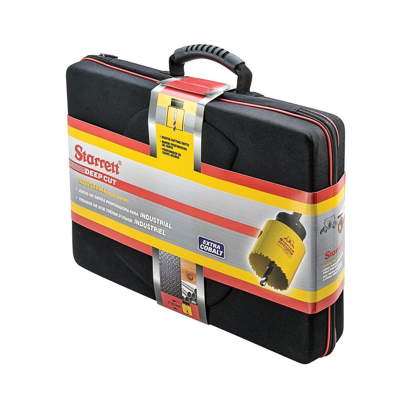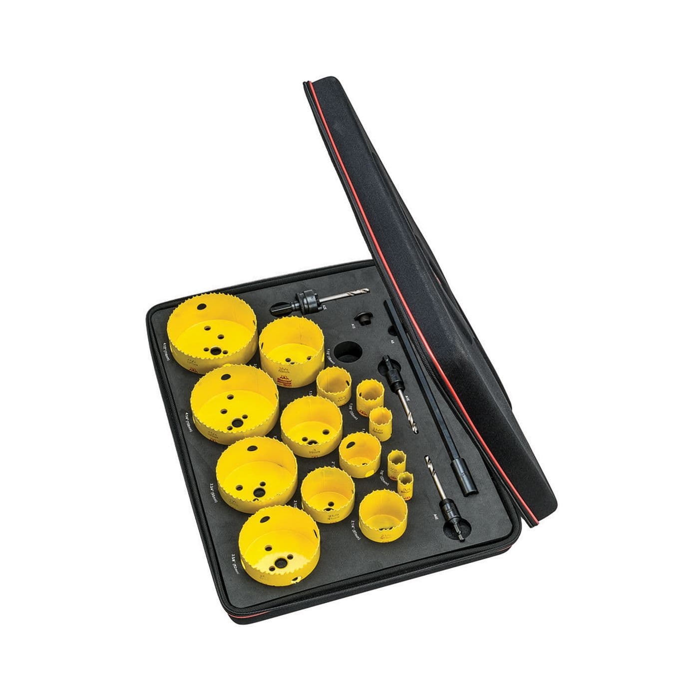 Le kit comprend quinze scies-cloches : 3/4 po (19,1 mm), 7/8 po (22,2 mm), 1-1/8 po (28,6 mm), 1-3/8 po (34,9 mm), 1-1/2 po (38,1 mm), 1-3/4 po (44,5 mm), 2 po (50,8 mm), 2-1/4 po (57,2 mm), 2-1/2 po (63,5 mm), 3 po (76,2 mm), 3-1/4 po (82,6 mm), 3-5/8 po (92,1 mm), 3-3/4 po (95,3 mm), 4-1/4 po (108,0 mm) et 4-1/2 po (114,3 mm).
