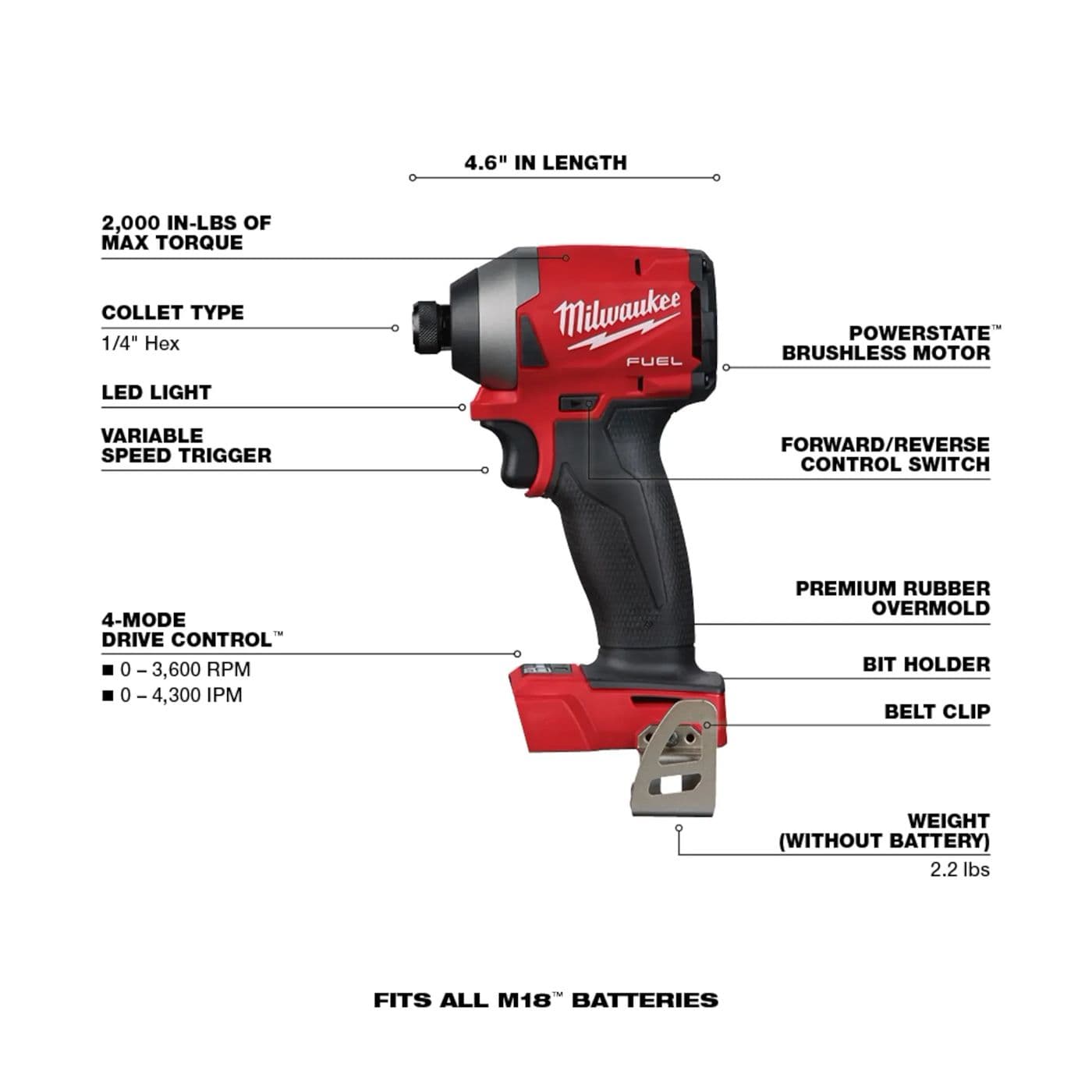 La visseuse à chocs hexagonale M18 FUELMC 1/4 po est la visseuse à chocs la plus puissante et la plus rapide, dotée d’un contrôle de déclenchement ultimate. Le moteur POWERSTATEMC Brushless offre une puissance inégalée pour une gamme complète de capacités afin de compléter la plus grande variété d’applications. Augmentez votre productivité sur le chantier avec la vitesse d’entraînement la plus rapide de toutes les visseuses à percussion sans sacrifier la puissance ou le contrôle. L’intelligence REDLINK PLUSMC offre un contrôle ultime de la déclencheuse en fournissant une accélération en douceur pour les petites fixations afin d’éviter de dénuder les vis ou d’endommager les matériaux. Les packs de batteries M18 REDLITHIUMMC offrent plus de travail par charge et plus de travail pendant la durée de vie du pack. La commande d’entraînement à 4 modes offre à nos utilisateurs un meilleur contrôle de la vitesse et de la puissance de sortie. Le mode vis autotaraudeuse est conçu pour réduire la marche lors du démarrage des vis autotaraudeuses ainsi que pour réduire la surcharge, la rupture et le dénudage des vis. Cette nouvelle visseuse à chocs est également équipée d’un éclairage Tri-LED, qui éclaire la zone de travail tout en éliminant les ombres. La visseuse à chocs hexagonale M18 FUEL 1/4 po fait partie de notre système M18 qui est entièrement compatible avec plus de 250+ solutions.