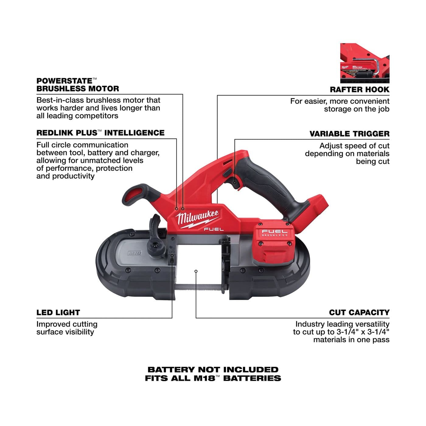La scie à ruban compacte M18 FUELMC offre une conception légère et équilibrée avec une capacité de coupe de 3 1/4 x 3 1/4 po, la plus grande de toutes les scies à ruban compactes. La scie à ruban compacte M18 FUELMC emploie un moteur sans balais POWERSTATEMC et la technologie Constant PowerMC pour les coupes les plus rapides dans sa catégorie. Notre scie à ruban portative est équipée de la technologie Jobsite ArmorMC, ce qui protège mieux l’outil des chutes et des débris grâce à un matériau composite exclusif et des barrières à zones d’absorption des chocs. La scie à ruban sans fil MILWAUKEEMD possède REDLINK PLUSMC Intelligence, le circuit électronique pour outils sans fil le plus avancé, afin de fournir une performance optimisée et la protection contre la surcharge en utilisant un système de communication totale entre l’outil, la batterie et le chargeur. Une gâchette à vitesse variable, un sabot verrouillable réglable sans outils et une lampe de travail à DEL vous offrent le contrôle et la productivité maximum. Un crochet de suspension intégré facilite le rangement entre les coupes. Les accessoires de la scie à ruban compacte M18 FUELMC comprennent un alésoir à tuyaux qui vous permet de facilement attacher l’alésoir sur mesure (49-90-2029, vendu séparément) à l’arrière de la scie à ruban afin de pouvoir faire l’alésage avec le même outil. Une lame pour la coupe du métal Extreme à 8/10 DPP est incluse.