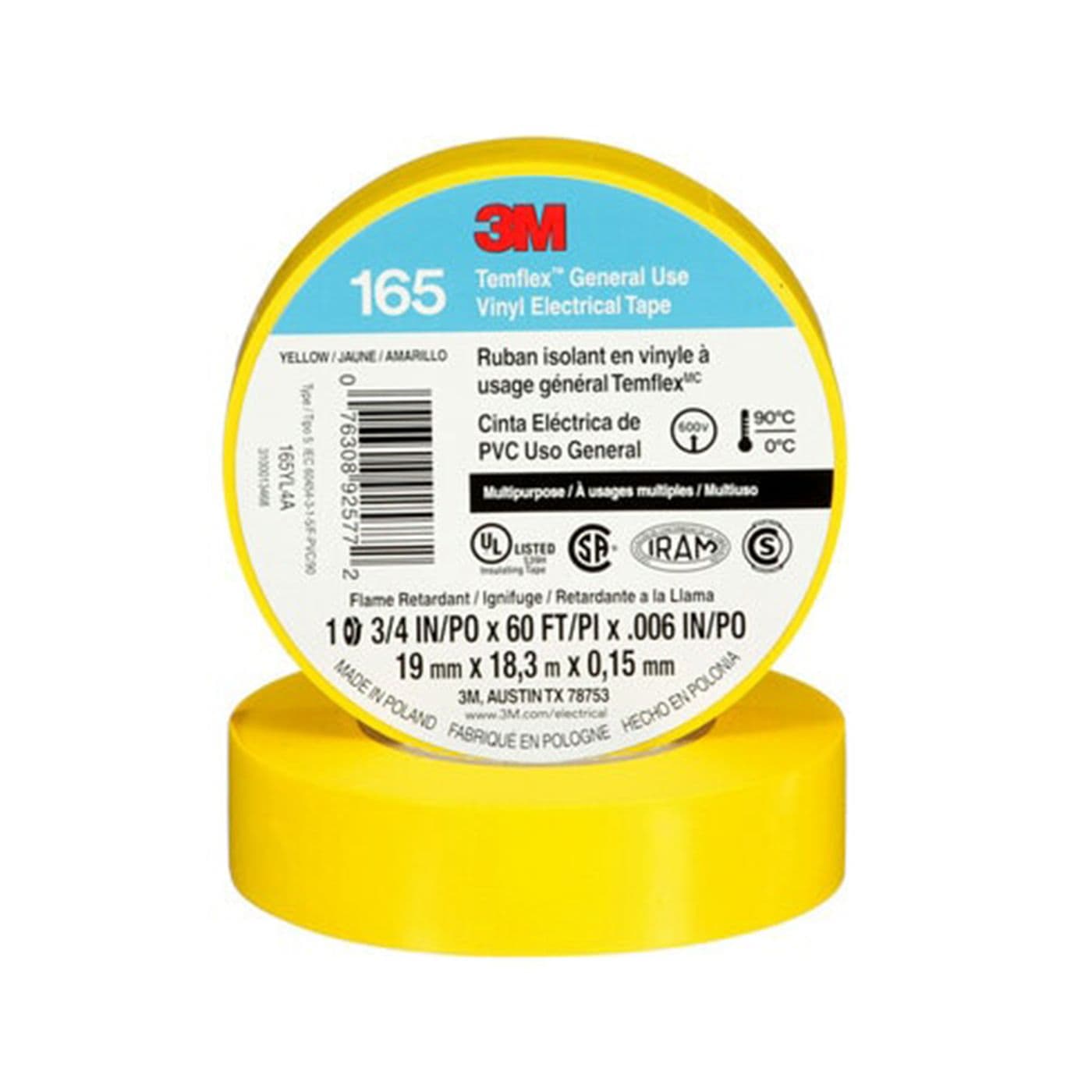 Ruban isolant en vinyle à usage général 165 TemflexMC, jaune, 19 mm x 18 m x 0,15 mm