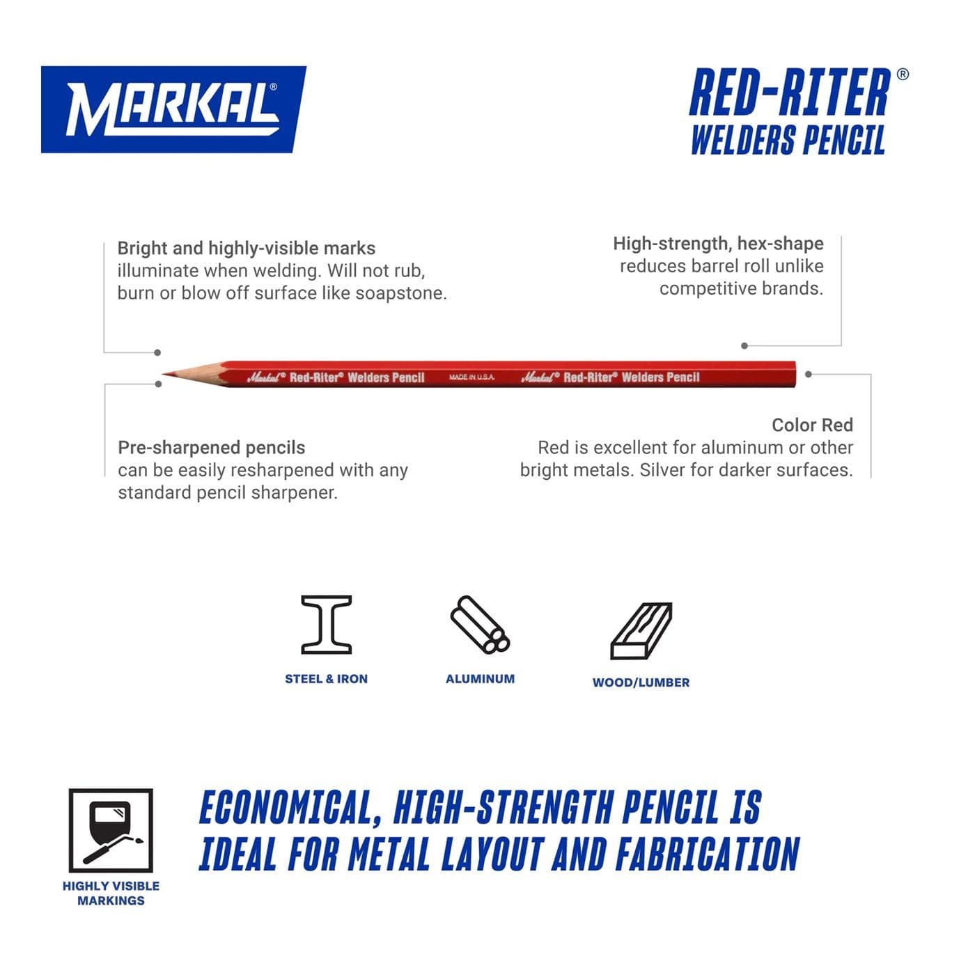 Les crayons de soudage MarkalMD Weld-RiterMD sont parfaits lorsque des marques très visibles et résistantes à la flamme sont nécessaires lors des travaux de traçage et de fabrication métalliques. Le crayon Red-RiterMD est idéal pour l’aluminium ou d’autres métaux brillants. Il marque sur toutes les surfaces métalliques, y compris celles huileuses ou humides.
