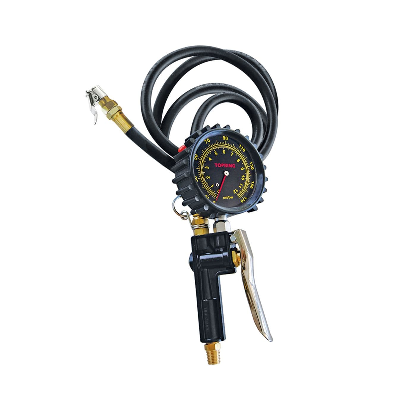 Modèle conçu pour les véhicules lourds avec pneus à haute pression et autres types de véhicules. Manomètre protégé contre les surpressions. Résistance accrue aux impacts. Anneau en acier de suspension pour accrocher la jauge. Trois fonctions : gonflage, dégonflage et mesure de la pression des pneus.